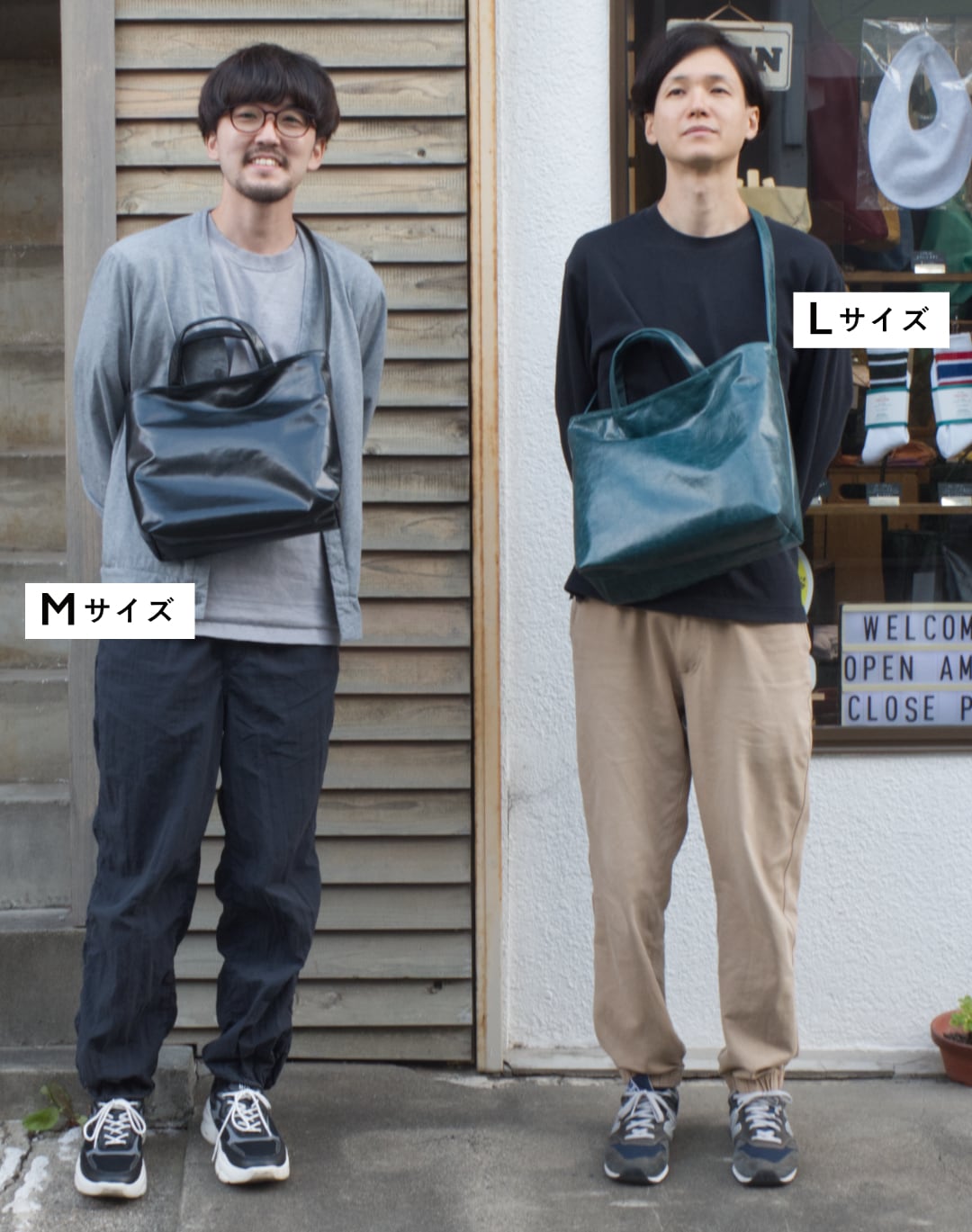 光沢感とハリがあり、少し厚みのある革を使用しているため、しっかり自立するバッグです。