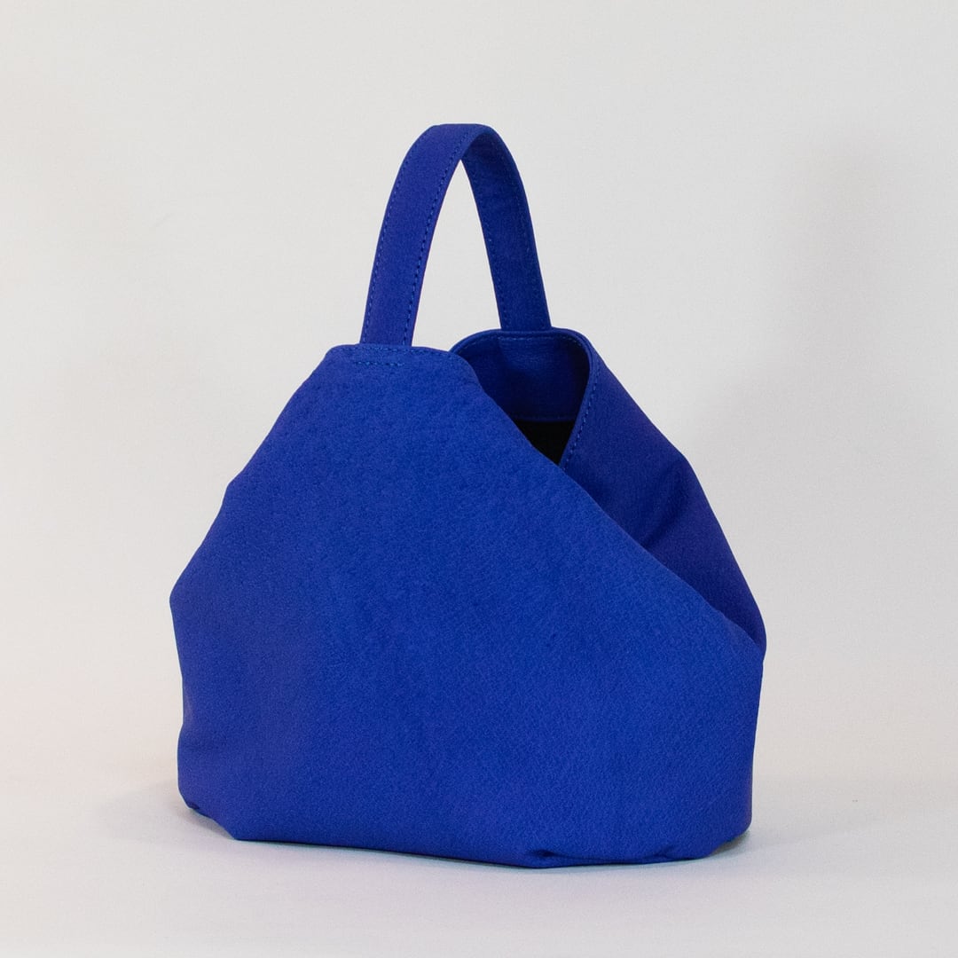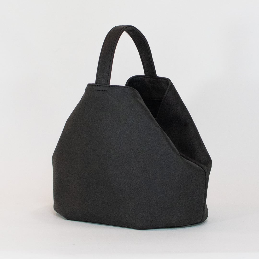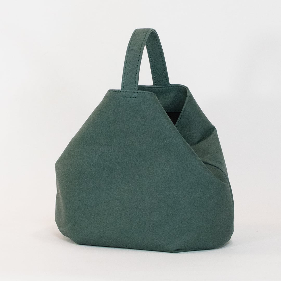 サイドにスナップボタンがついており、留めなければペットボトルやお財布、スマートフォンが収まり、留めるとおにぎりのようなコロコロしたフォルムに変化します。